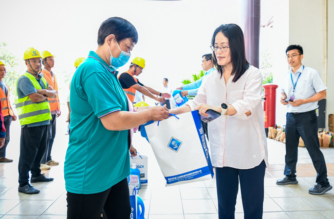 “大家在做好本職工作同時(shí),注意保重身體,防暑措施一定要做到位,確保安全生產(chǎn)。”在明日鄰里中心慰問(wèn)現(xiàn)場(chǎng),李蘭霞與物業(yè)員工們親切交談,感謝他們?yōu)楣景l(fā)展和民生保障付出的辛勤努力,反復(fù)叮囑大家要提高夏日防暑意識(shí),做好自我防護(hù),確保以更好的狀態(tài)投入到工作中。現(xiàn)場(chǎng)強(qiáng)調(diào)各部門要守牢安全底線,做好高溫時(shí)節(jié)各項(xiàng)工作,普及好防暑降溫和急救知識(shí),確保廣大一線職工的安全。